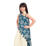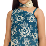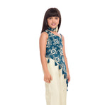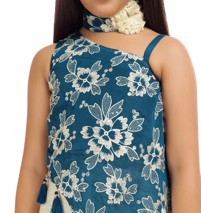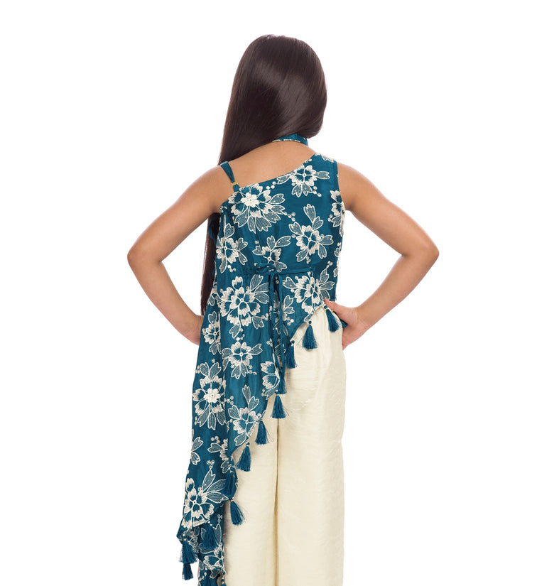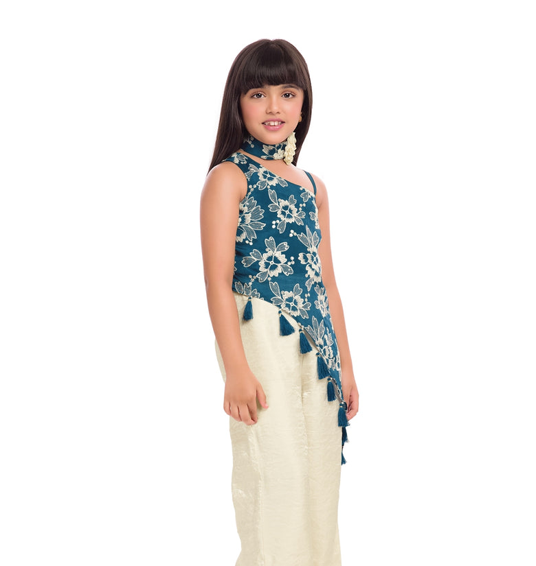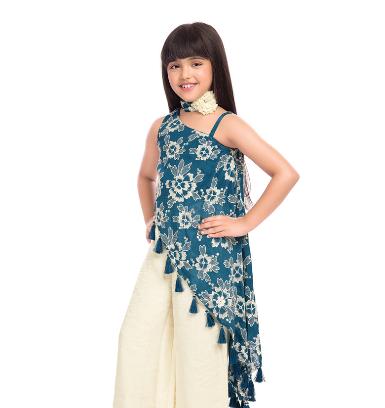 Add a fresh festive charm to your child’s wardrobe with this elegant Tiny Kingdom teal and ivory co-ord set. Designed with a beautifully embroidered floral top featuring stylish tassel detailing and paired with comfortable palazzo pants, this outfit blends modern style with traditional elegance. The soothing color combination makes it a perfect choice for festive occasions and celebrations.