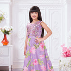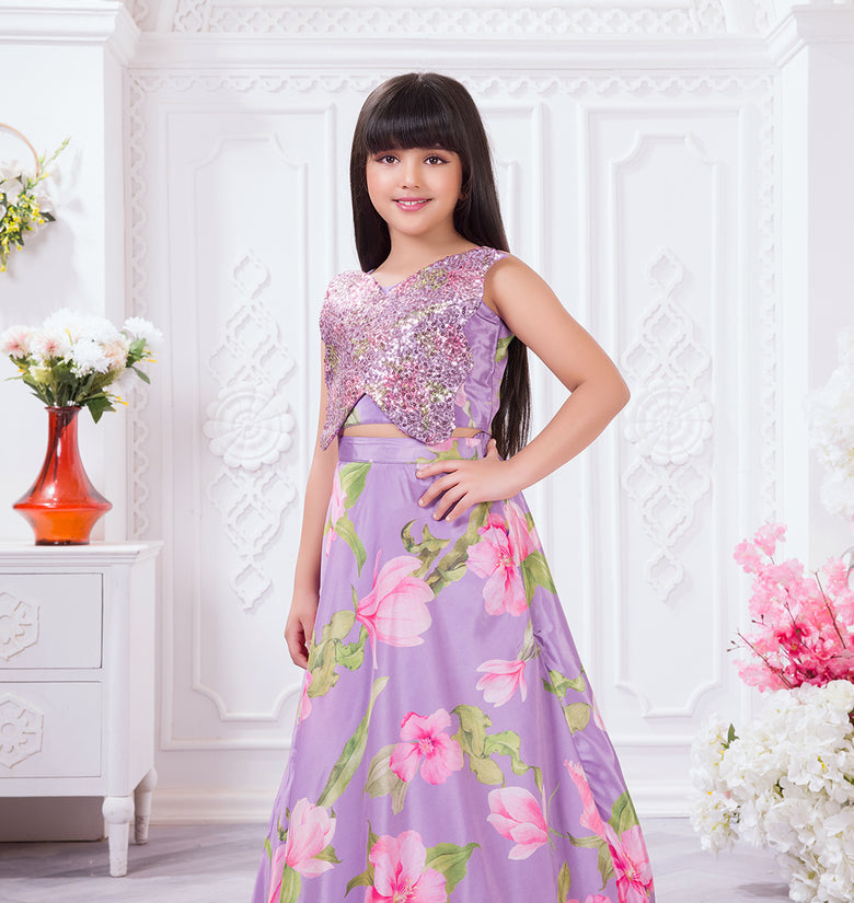 Add a touch of sparkle to festive celebrations with this elegant Tiny Kingdom lehenga set. Designed with a shimmering sequin crop top and a soft purple floral printed lehenga, this outfit combines charm, comfort, and graceful movement—perfect for special occasions.