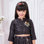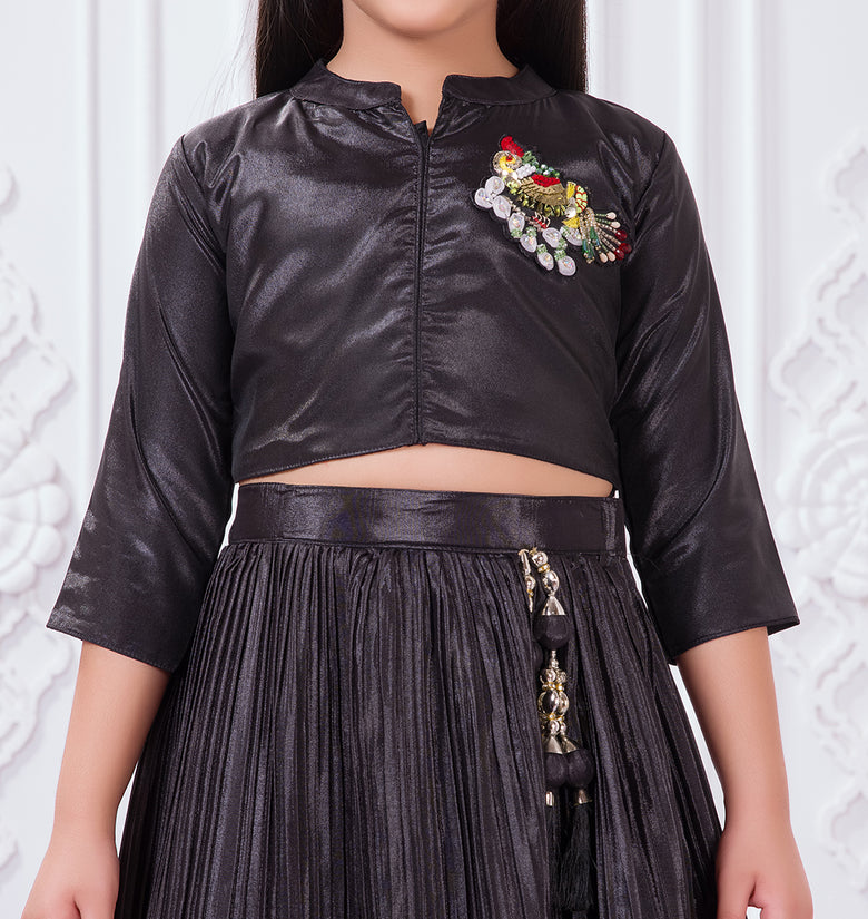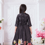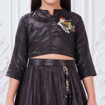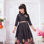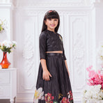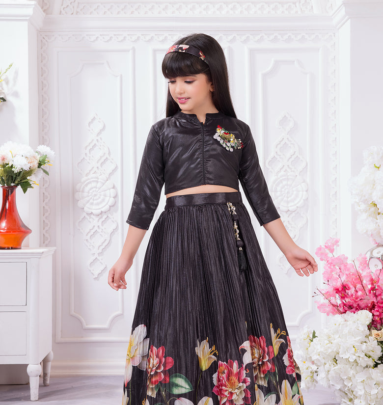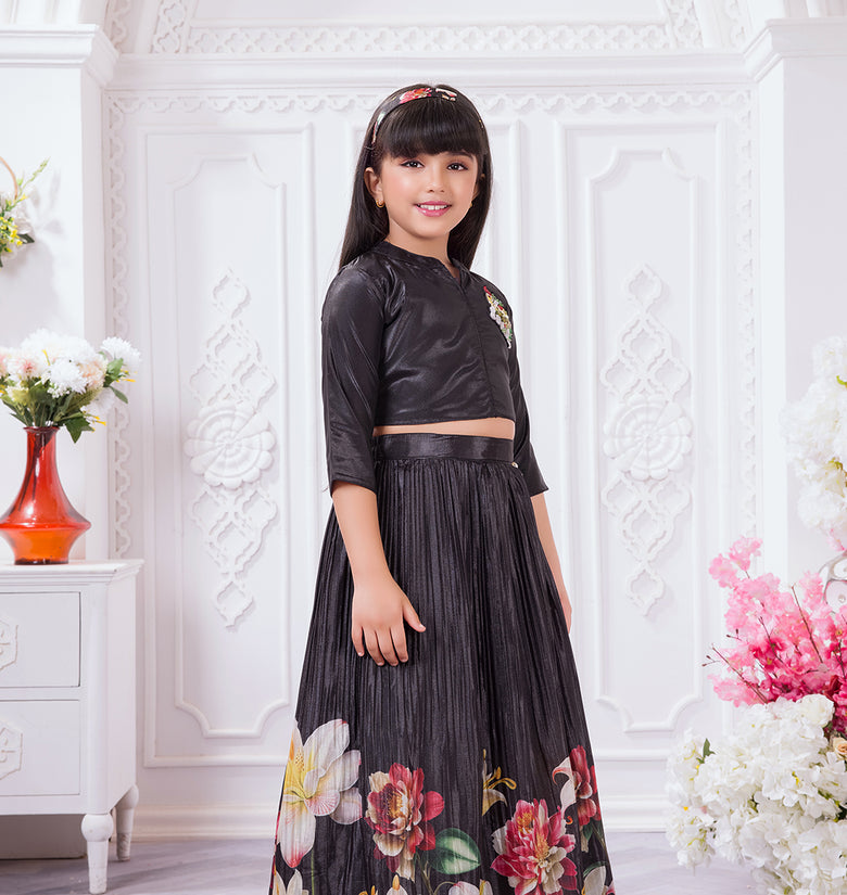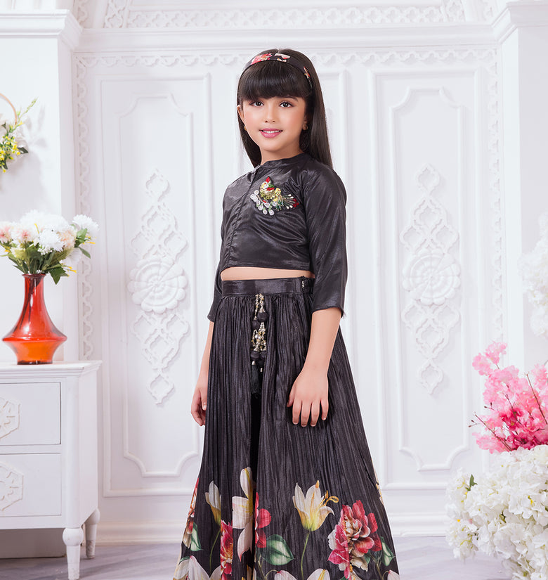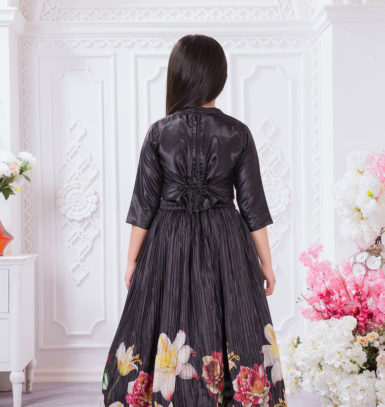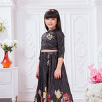 Add a graceful festive touch to your child’s wardrobe with this elegant Tiny Kingdom lehenga set. Featuring a sleek black top with delicate embellishment and a flowy pleated lehenga skirt with vibrant floral prints, this outfit blends modern style with festive charm—perfect for special occasions.