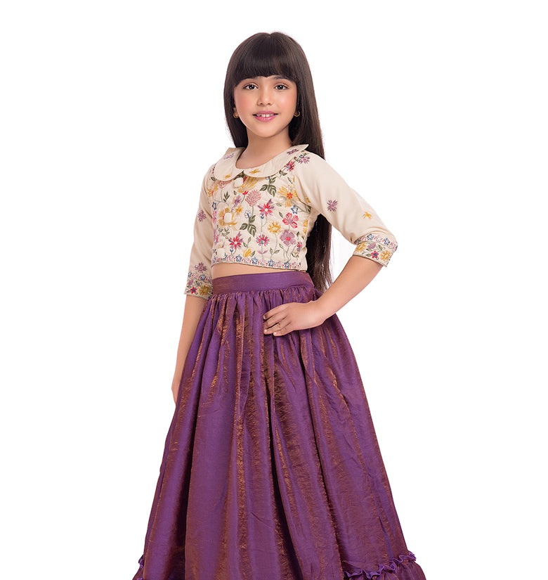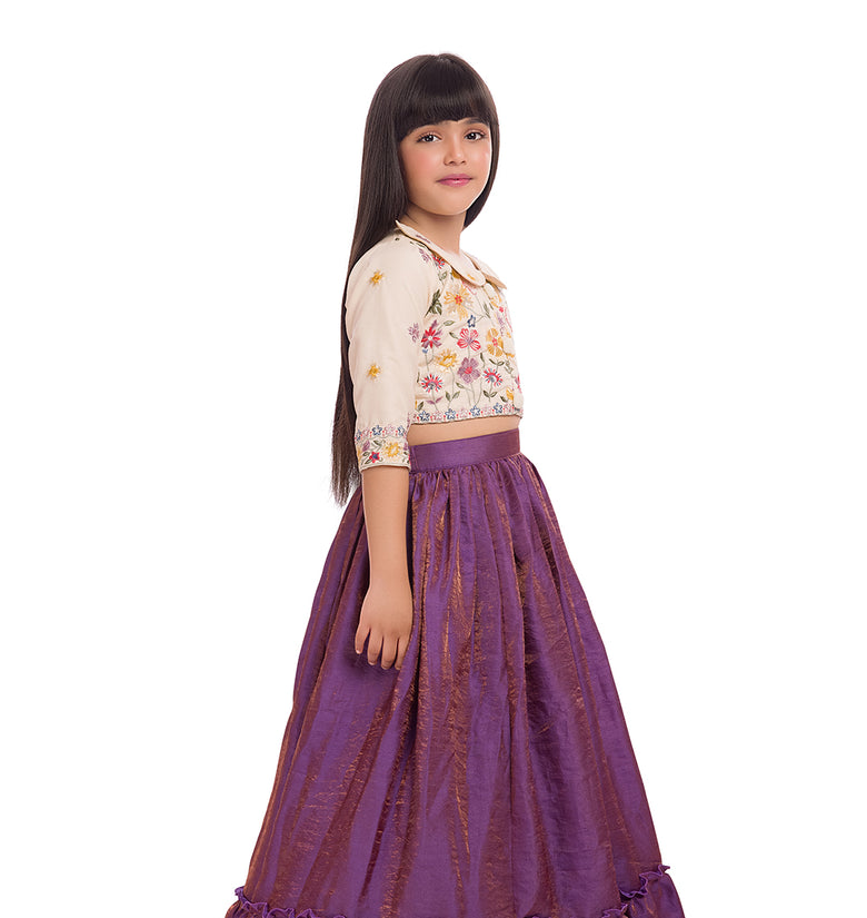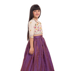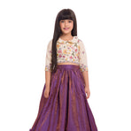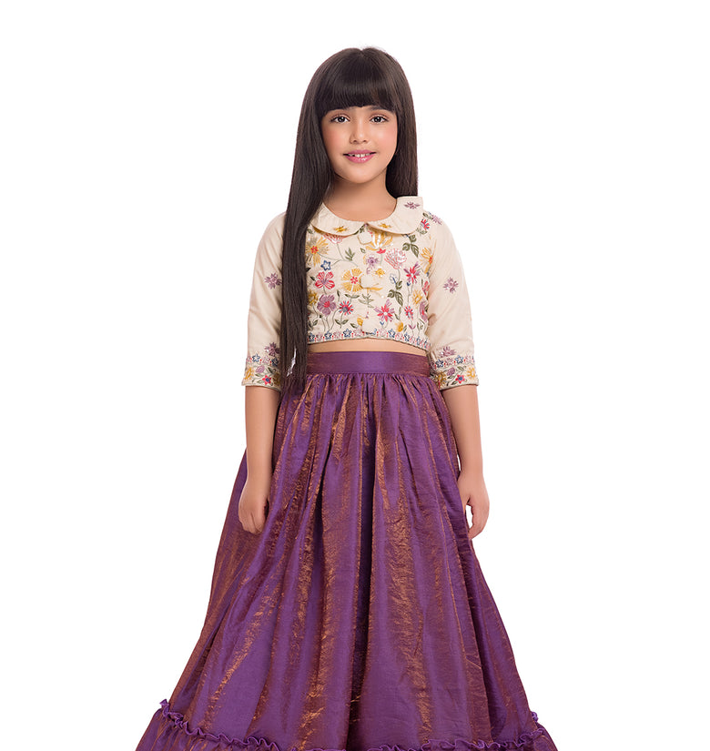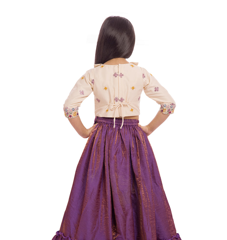 Tiny Kingdom Ivory Embroidered Top with Purple Lehenga Skirt for Girls