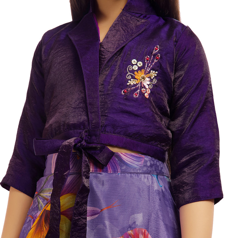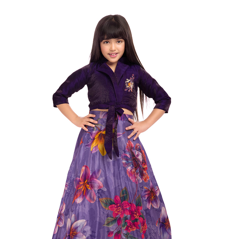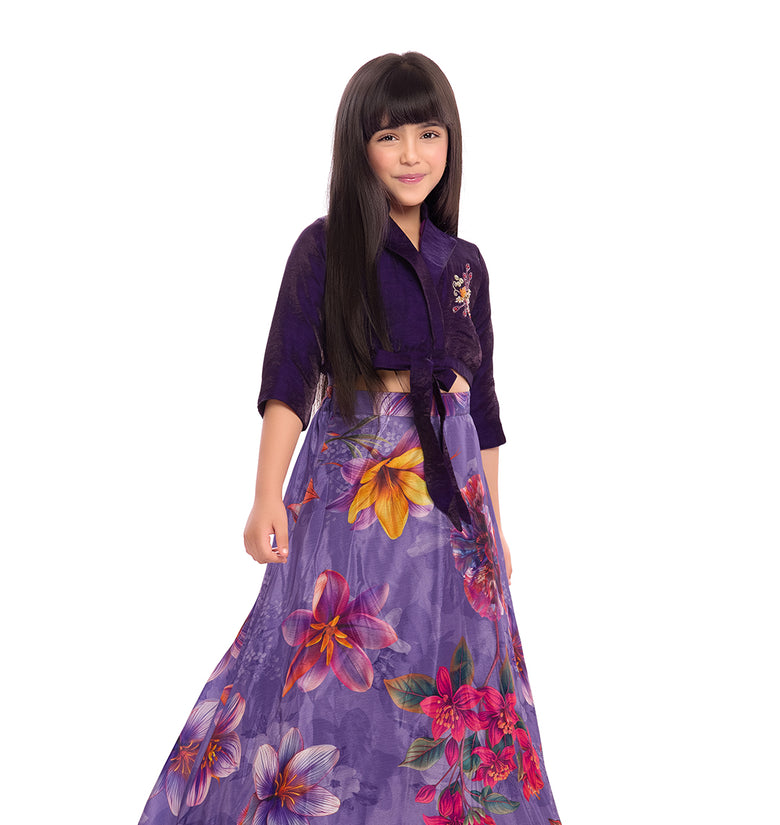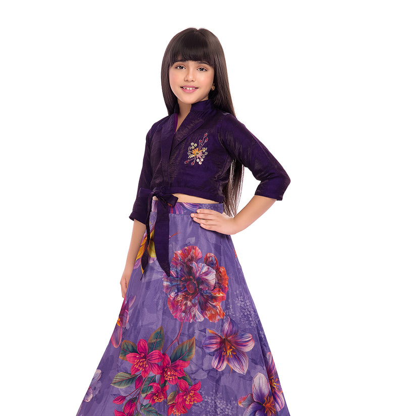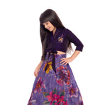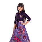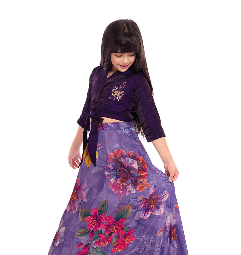 Add timeless elegance to your child’s festive wardrobe with this beautifully designed Tiny Kingdom purple skirt set. Featuring an embroidered wrap-style top paired with a flowy floral printed skirt, this outfit blends traditional charm with modern comfort. The rich purple tones and artistic floral prints make it a perfect choice for festive gatherings and special celebrations.