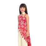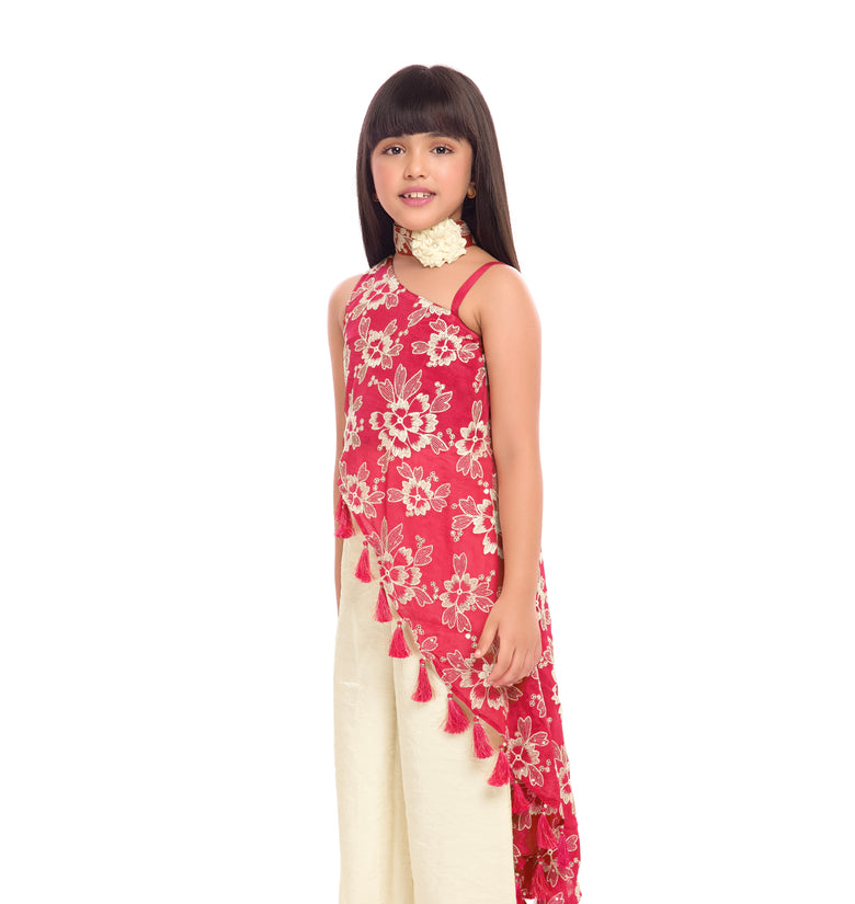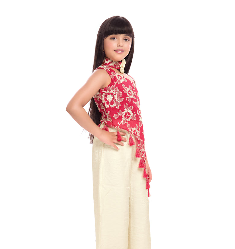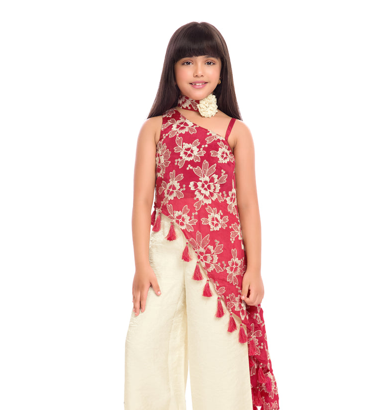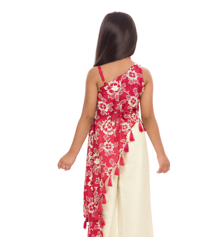 Add a festive sparkle to your child’s wardrobe with this elegant Tiny Kingdom red and ivory co-ord set. Designed with a beautifully embroidered floral top featuring tassel detailing and paired with comfortable palazzo pants, this outfit blends traditional charm with modern style. The rich red shade combined with soft ivory tones makes it a perfect choice for celebrations and special occasions.